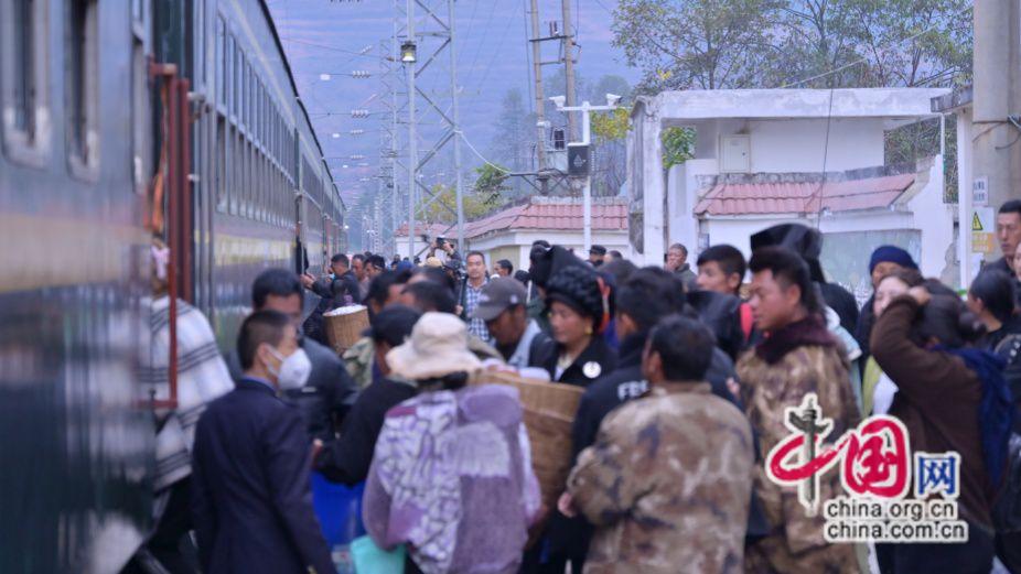 2024年11月20日,彝歷新年第一天,成昆線5633次慢火車(chē)??吭谡九_(tái),彝族同胞有序乘車(chē)。原波 攝