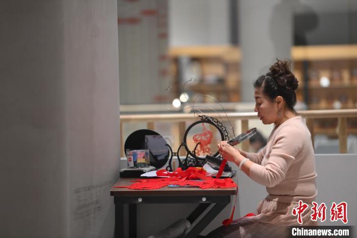 11月23日,甘肅省蘭州市楊樹珍剪紙工作室內(nèi),楊樹珍團隊成員制作剪紙漢服作品。中新社記者 李亞龍 攝