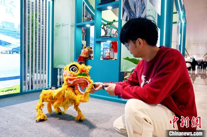11月26日,四川成都,與會(huì)嘉賓和機(jī)器人獅子互動(dòng)。中新社記者 安源 攝