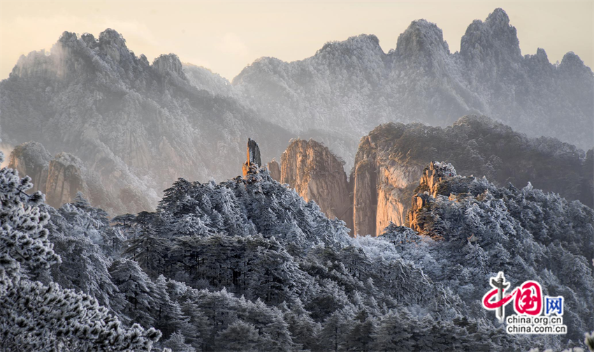 11月25日夜,安徽黃山風(fēng)景區(qū)迎來入冬首場(chǎng)降雪。26日,雪后初霽,五百里黃山銀裝素裹、分外妖嬈。山峰、奇松、怪石在朝陽(yáng)的關(guān)愛下披上了一層金色的外衣。松林相間雪花層疊,熠熠生輝,翠色與銀白交織,宛如瓊枝玉樹,讓人流連忘返。