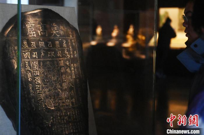 11月28日,甘肅省敦煌市,敦煌研究院敦煌石窟文物保護(hù)研究陳列中心,游人參觀《披沙揀金——敦煌研究院館藏文物擷英展》中的碑刻。該展由敦煌研究院主辦,2024年下半年煥新布展,展出了不同類(lèi)型館藏文物,通過(guò)這些文物蘊(yùn)含的豐富歷史信息,展現(xiàn)了敦煌文化的多元與包容,勾勒不同文明偕行共進(jìn)的歷史脈絡(luò)。中新社記者 李亞龍 攝