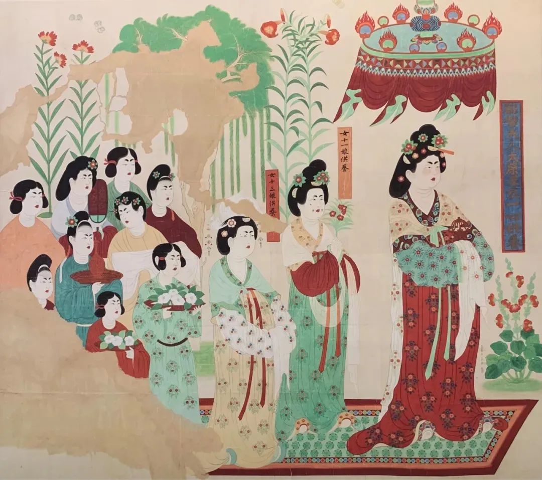 (2)莫高窟第130窟飛天壁畫修復(fù)當(dāng)我在第161窟修復(fù)壁畫時,突然聽到洞窟外一聲巨響,我猜想,應(yīng)該是洞窟發(fā)生了坍塌。于是我趕緊循聲而去,發(fā)現(xiàn)發(fā)出巨大聲響的是第130窟,第130窟北壁上部壁畫為飛天,其中空鼓壁畫大面積脫落,有2平方米多。脫落的壁畫掉在了佛腳上,碎成了一地。未脫落壁畫的邊緣十幾厘米都已脫離墻壁,隨時有脫落的風(fēng)險。我于是向常書鴻先生匯報,然后我們上報國家文化部。國家文化部批示,對第130窟進行加固維修。