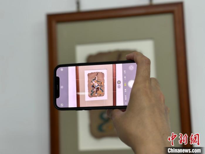 12月17日,由蘭州市七里河區(qū)委宣傳部、七里河區(qū)文體旅局聯(lián)合舉辦的“大漠孤陽映彩霞 敦煌神韻美如畫”新時(shí)代文明實(shí)踐主題活動(dòng)暨敦煌巖彩畫書畫藝術(shù)展拉開帷幕。圖為參觀者拍攝展出的“反彈琵琶”題材巖彩畫。楊娜 攝