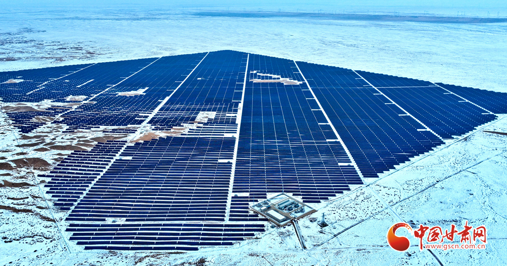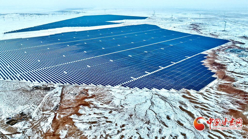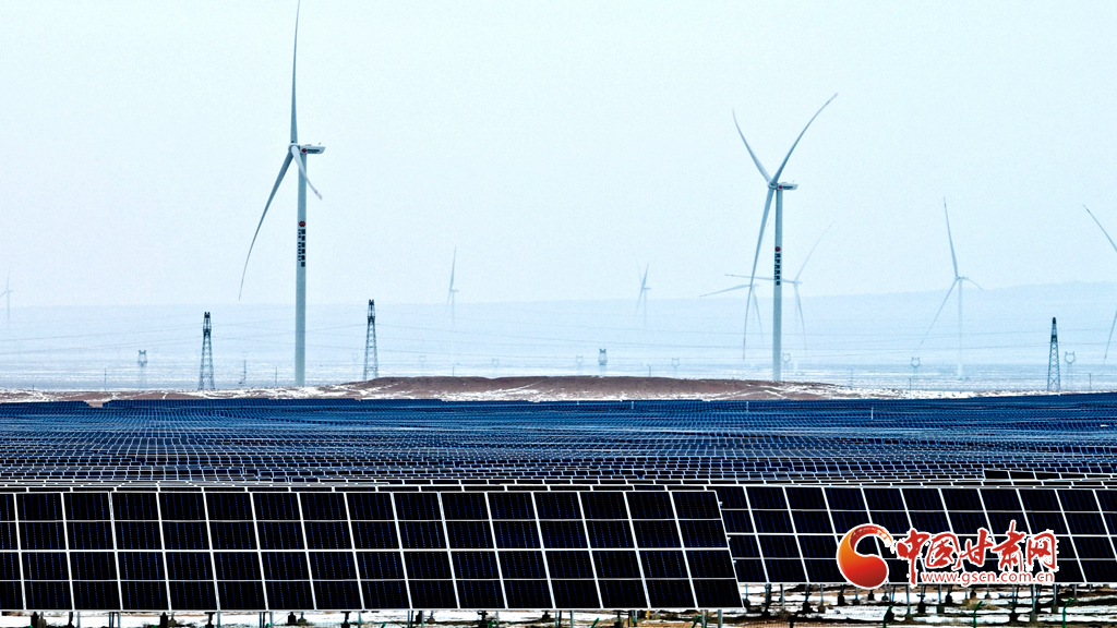 12月18日, 一場大雪過后,大漠深處的張掖市臨澤縣北部灘新能源產(chǎn)業(yè)園內(nèi),81.1萬千瓦光伏治沙光伏集陣和85萬千瓦風(fēng)力發(fā)電機(jī)組群,在防沙治沙的同時(shí)將光熱和風(fēng)力轉(zhuǎn)換為電能輸入國家電網(wǎng),推進(jìn)了“西電東送”輸電工程建設(shè)。