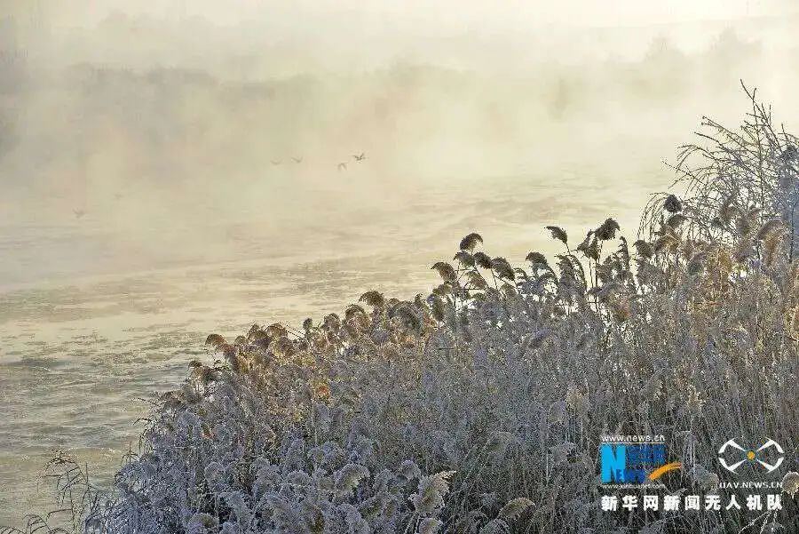 寒冬里,日出時(shí)分,這里霞光綻放,萬物蘇醒,兩岸的霧凇冰清玉潔,上演晨間浪漫。