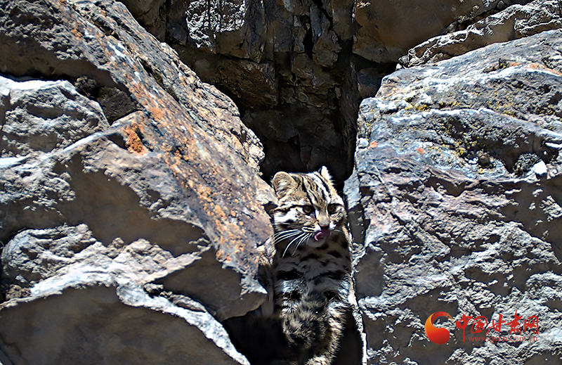 午后陽(yáng)光穿透云層,灑在祁連山斑駁的巖壁上,一只豹貓?zhí)匠隽嗣兹椎哪X袋,它身披棕黃色與灰黑相間的斑紋皮毛,琥珀色的瞳孔閃爍著機(jī)敏的光芒,小家伙在警惕周?chē)耐瑫r(shí),愜意的弓背伸爪舒展身軀,享受著溫暖的日光。