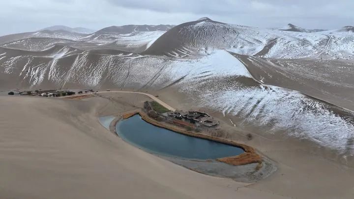 這是2014年11月23日拍攝的敦煌市鳴沙山月牙泉景區(qū)雪景(無人機(jī)照片)。新華社發(fā)(張曉亮攝)