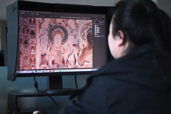2023年4月25日,敦煌研究院文物數(shù)字化保護(hù)團(tuán)隊(duì)圖像處理人員年海麗在拼接壁畫圖像。新華社記者 陳斌 攝