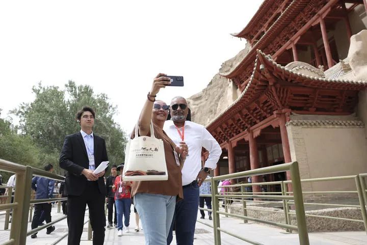 2024年6月7日,前來甘肅調(diào)研考察的駐華外交官在敦煌莫高窟九層樓前留影。新華社記者 陳斌 攝