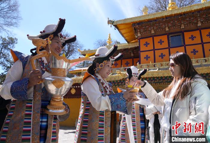 2月20日,由西藏自治區(qū)文化和旅游廳舉辦的2025年香港至拉薩航班首航旅行團歡迎儀式在羅布林卡舉行。來自香港的游客將前往布達拉宮、大昭寺等地,開啟冬游西藏旅途。2月19日,拉薩至香港的首條地區(qū)航線正式開通。航線的開通,更加便捷了兩地居民的出行,也將進一步促進兩地在旅游、文化、經(jīng)貿(mào)等領域的交流與合作。圖為歡迎儀式現(xiàn)場,工作人員向香港游客敬獻青稞酒。中新社記者 李林 攝