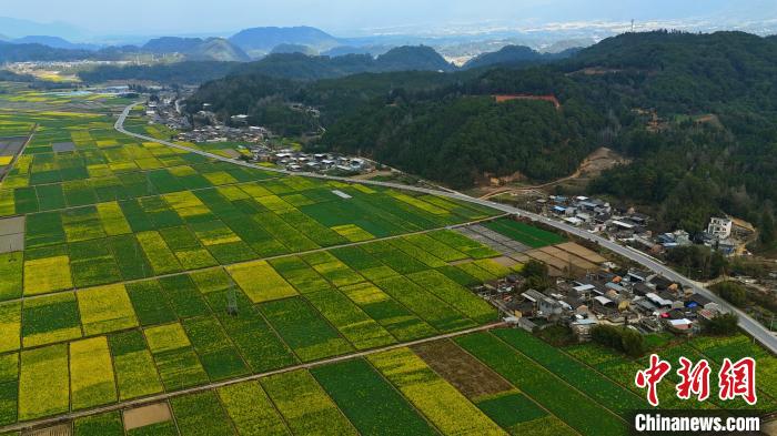 近日,云南省騰沖市界頭鎮(zhèn)成片的油菜花盛開(kāi),吸引不少游客前來(lái)觀光。金黃的油菜花海與遠(yuǎn)處白墻黛瓦的村落相映成趣,共同繪就一幅寫(xiě)意的水墨畫(huà)。圖為油菜花田航拍。趙輝 攝