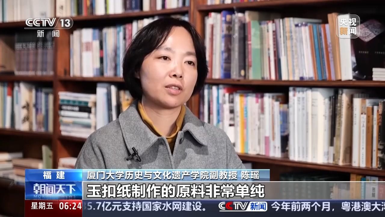 廈門(mén)大學(xué)歷史與文化遺產(chǎn)學(xué)院副教授 陳瑤:玉扣紙制作的原料非常單純。就是三種,一個(gè)是竹子嫩竹,第二個(gè)是石灰,第三個(gè)就是清潔的山泉水?;旧鲜羌兛咳斯?lái)進(jìn)行品質(zhì)的管控。