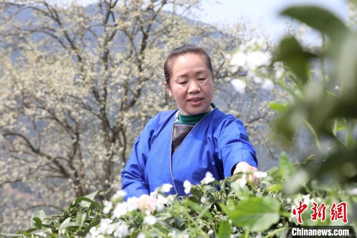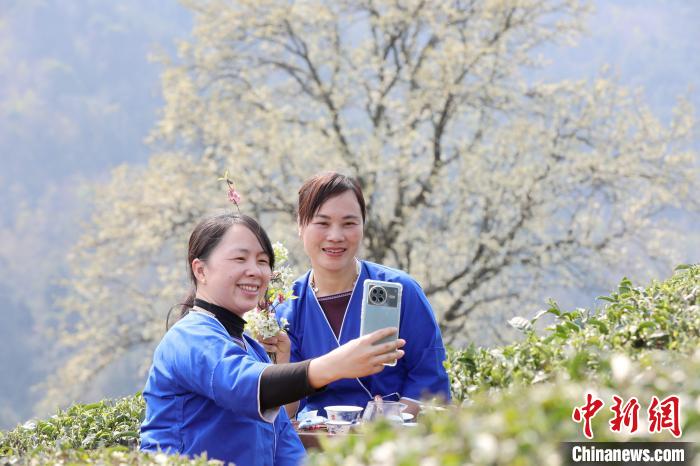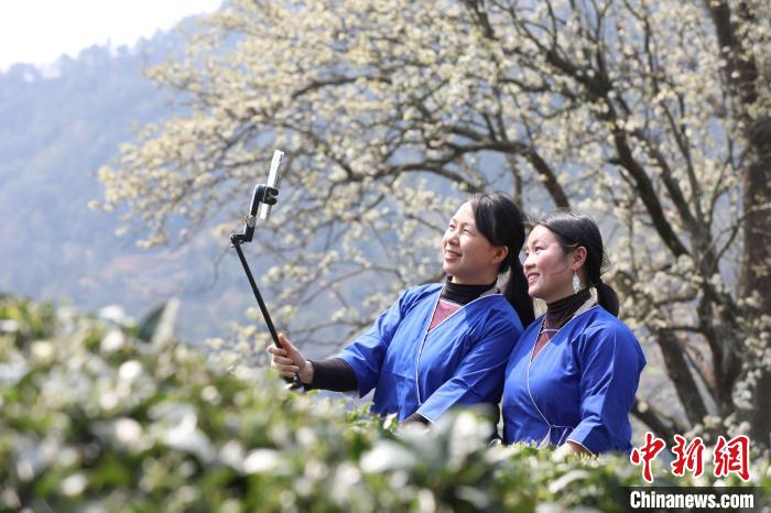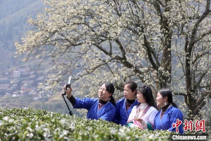 3月16日,廣西三江侗族自治縣八江鎮(zhèn)歸令村六更屯種植的千樹梨花迎春綻放,與青翠茶園、特色民居相映成趣,構(gòu)成一幅如詩如畫的春日畫卷。當?shù)卮迕窦坝慰图娂娗皝聿刹栀p花、“打卡”拍照,享受春日美好時光。圖為村民在采春茶。龔普康 攝