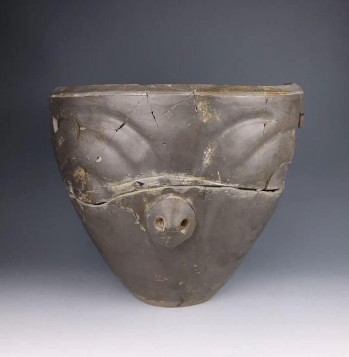 然而,馬家窯人的藝術(shù)創(chuàng)造力似乎遠(yuǎn)不止于此。寺洼遺址新出土的眾多陶器展現(xiàn)出全新的造型與紋飾風(fēng)格。如其中一件帶有“豬鼻”的馬家窯類型泥質(zhì)灰陶,色澤深沉灰黑如夜,一只鼻子自陶胎中緩緩隆起,上方的弧形紋理像舒展的眉骨,又像張開的羽翼,一場古文明的夢(mèng)境由此展開。