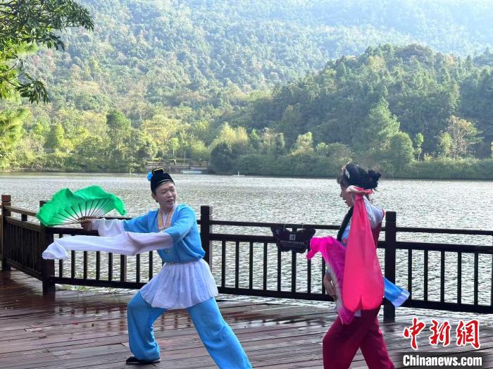 2024年11月,贛南采茶戲演員在江西贛州安遠(yuǎn)縣三百山景區(qū)表演采茶戲。(資料圖)安遠(yuǎn)縣采茶戲保護(hù)傳承中心 供圖