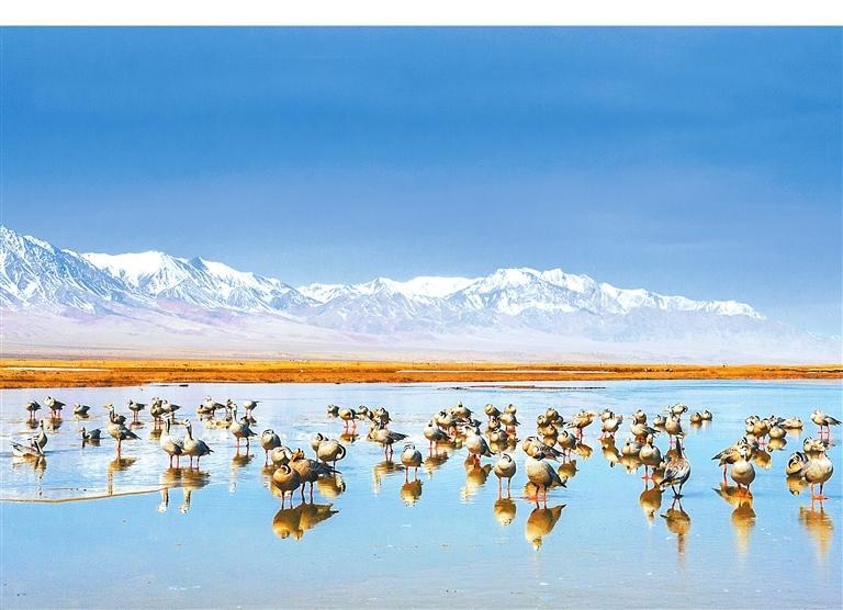 當祁連山的雪線以肉眼難以察覺的速度后退時,鹽池灣的冰封鏡面開始出現(xiàn)裂紋。最先感知到這一變化的不是融水沖刷出的溝壑,而是斑頭雁黃色的喙。它們在三月底的晨昏線上劃過,雙翅呼呼生風。冰凌碎屑尚未與雁羽摩擦,便已發(fā)出細密的簌響,像是古琴開弦前的調音。野馬南山與黨河南山兩山之間形成的盆地內河流縱橫、湖泊密布,草甸、沼澤交錯,是斑頭雁和其他水鳥世代棲息繁衍的場所。盡管先頭部隊在3月下旬就已抵達這里,主力部隊卻要到4月上旬才會姍姍來遲。此時斑頭雁幼體已在越冬地充分發(fā)育,羽衣上幾乎看不到如苔蘚般斑駁生長的新羽,只是頭部的兩條黑帶不如父母深邃,這是它們少經(jīng)風霜的證明。它們降落在濕地灘涂時,雝雝鳴雁,那聲音或許與兩千年前蘇武牧羊時在北海之畔聽到的有些許相似。