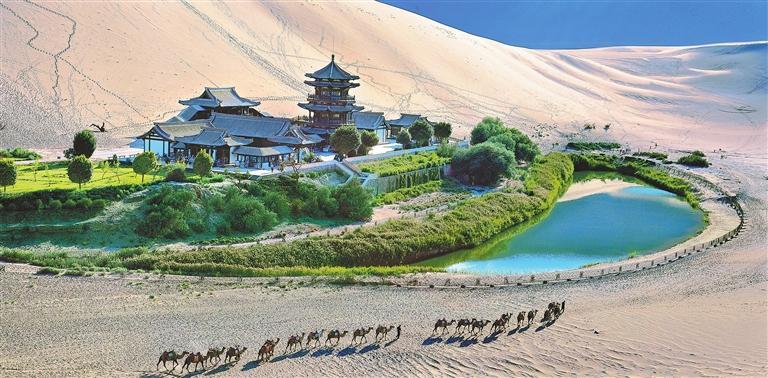 鳴沙山以沙山稱奇,多變的沙丘是其更具魅力的體現(xiàn)。在風(fēng)的不斷作用下,使得鳴沙山保持其特有的高度和形式。也正是因?yàn)轱L(fēng)的作用,不同的物質(zhì)在鳴沙山聚集,形成了特有的黑、綠、紅、黃、白五種顏色不同的沙子。而月牙泉就是被鳴沙山包圍,因沙泉相擁千年不涸而聞名于世,坐落在兩個(gè)古老沖積扇之間的月牙泉,由于地下水不斷流出松散沉積層形成泉,逐漸演化成世界地質(zhì)遺跡奇觀。