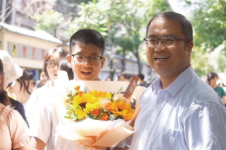 花束也是祝福的首選,“一舉奪魁”的向日葵更是家長(zhǎng)們的最愛。在各考點(diǎn)附近的鮮花店里,以向日葵為核心的花束賣得格外好。首科的語(yǔ)文考試結(jié)束后,考生們最先收到的就是鮮花,還有媽媽的擁抱。