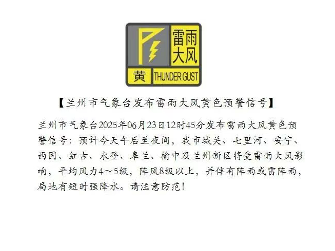 蘭州市氣象臺2025年06月23日12時45分發(fā)布雷雨大風(fēng)黃色預(yù)警信號:預(yù)計今天午后至夜間,我市城關(guān)、七里河、安寧、西固、紅古、永登、皋蘭、榆中及蘭州新區(qū)將受雷雨大風(fēng)影響,平均風(fēng)力4~5級,陣風(fēng)8級以上,并伴有陣雨或雷陣雨,局地有短時強降水。請注意防范!