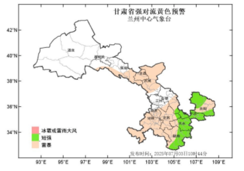蘭州中心氣象臺2025年7月3日10時44分繼續(xù)發(fā)布強對流黃色預(yù)警:預(yù)計未來24小時,張掖、金昌、武威、蘭州、白銀、甘南、臨夏、定西、隴南、天水、平?jīng)?、慶陽等州市有雷暴,其中隴南、天水、平?jīng)觥c陽等市部分地方及白銀、定西兩市局部地方有短時強降水,最大小時雨強20-60mm;隴南、天水、平?jīng)?、慶陽等市強降水在未來24小時內(nèi)多發(fā),白銀、定西主要強降水時段在4日2-8時。請注意防范!