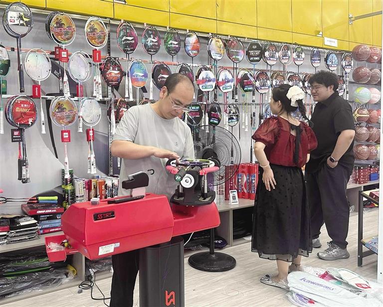 不僅如此,運動用品銷售也迎來小高峰。瑞德摩爾太平洋商場內的健雄體育用品店內,老板正忙著給羽毛球空拍穿線。“我們不僅有現(xiàn)成的羽毛球拍,還可以根據(jù)客戶的需求給空拍穿線。”該店老板介紹,羽毛球拍網線價位30至100元不等,購線還可免手工費。羽毛球初學者一般都會買成品拍自己在家練習,而一些技術較好的顧客除了會選擇品質較好的空拍,還會現(xiàn)場選線拉網定制屬于自己的球拍。“暑假以來,店內羽毛球拍銷量大增,穿線需求也逐漸增多,周末從早忙到晚,每半小時穿一個球拍,最多一天穿24個,排隊等候已成常態(tài)。”此外,不少運動品牌也順勢推出促銷活動,吸引消費者選購。
