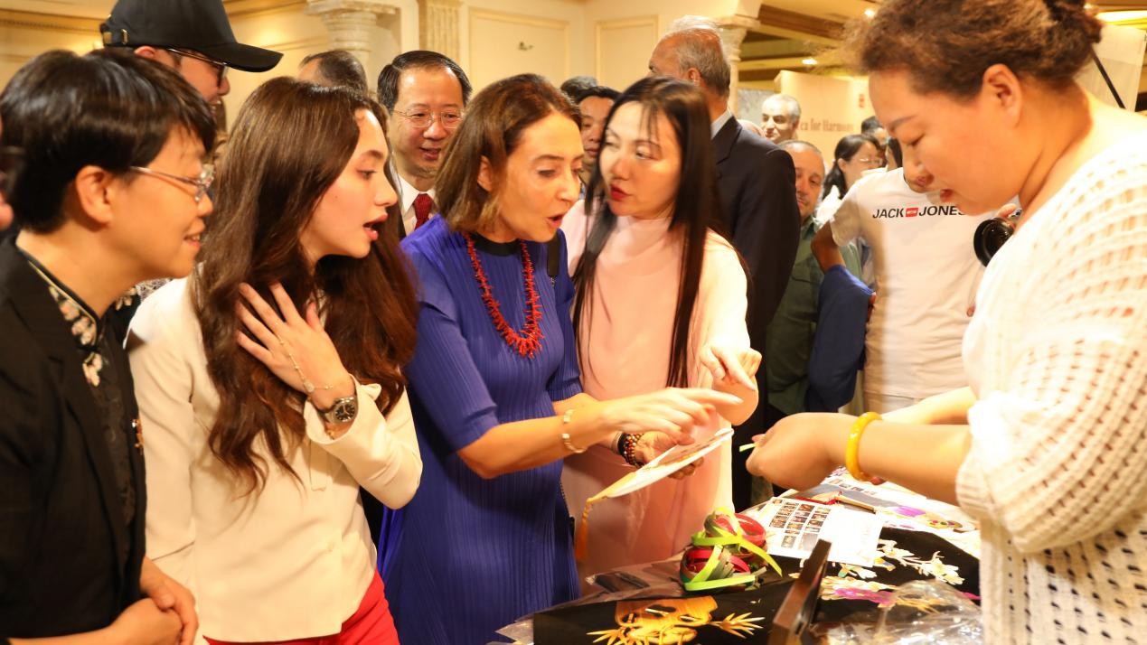 在今年5月18日“茶和天下——甘肅文旅推廣”安曼現(xiàn)場(chǎng),唐彩萍現(xiàn)場(chǎng)制作的麥桿畫(huà)以獨(dú)特魅力驚艷全場(chǎng),約旦王妃和加莉拉公主被其精湛的工藝深深吸引,親自上手體驗(yàn)后豎起大拇指稱她是“奇人”。今年6月在“根與魂——甘肅省非遺澳門(mén)展演會(huì)”上,唐彩萍制作的麥桿畫(huà)《和平鴿》《中國(guó)龍》贏得與會(huì)人士的高度贊賞,澳門(mén)特別行政區(qū)政府文化局局長(zhǎng)梁惠敏稱贊其“不同凡響,值得傳承發(fā)揚(yáng)”,并當(dāng)場(chǎng)邀請(qǐng)?zhí)撇势紴榘拈T(mén)小朋友傳授麥桿畫(huà)的制作方法。