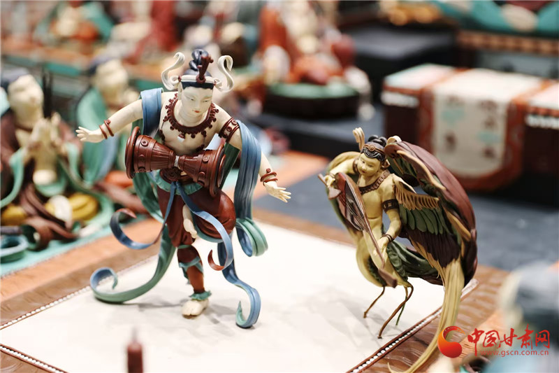 今年蘭洽會甘肅非遺館,正中央的敦煌文化題材《觀無量壽經(jīng)變》面塑受到客商全員追捧。經(jīng)過這里的人都會駐足欣賞,感受面塑藝術的精彩絕倫,其中,敦煌題材的面塑,飛天人物似乎從壁畫里飛了出來,栩栩如生。