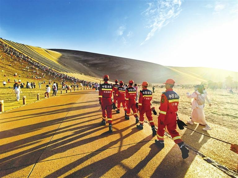 敦煌市消防救援大隊指戰(zhàn)員在鳴沙山月牙泉景區(qū)開展流動執(zhí)勤。