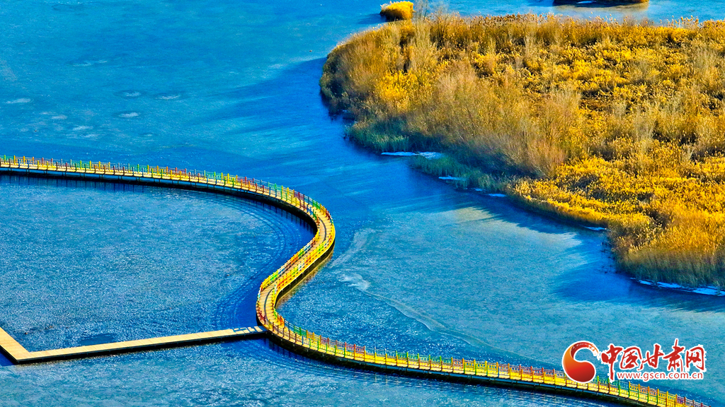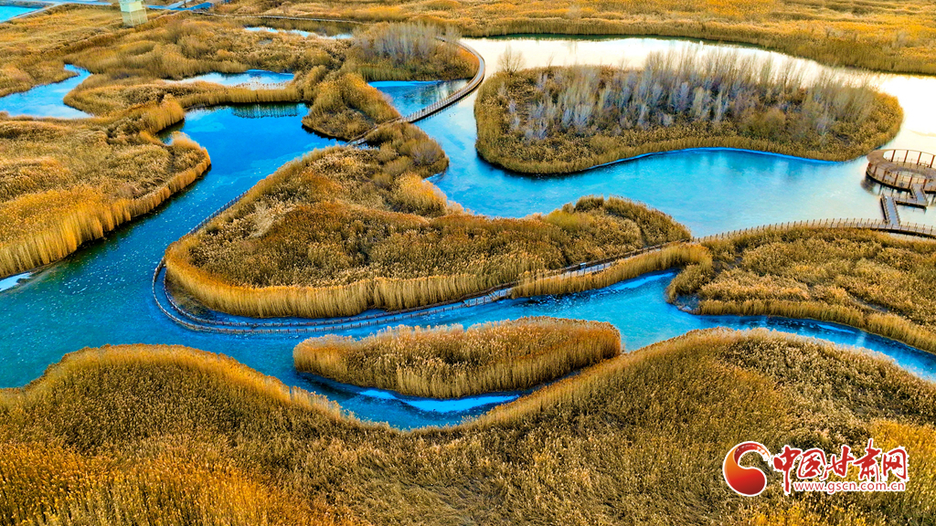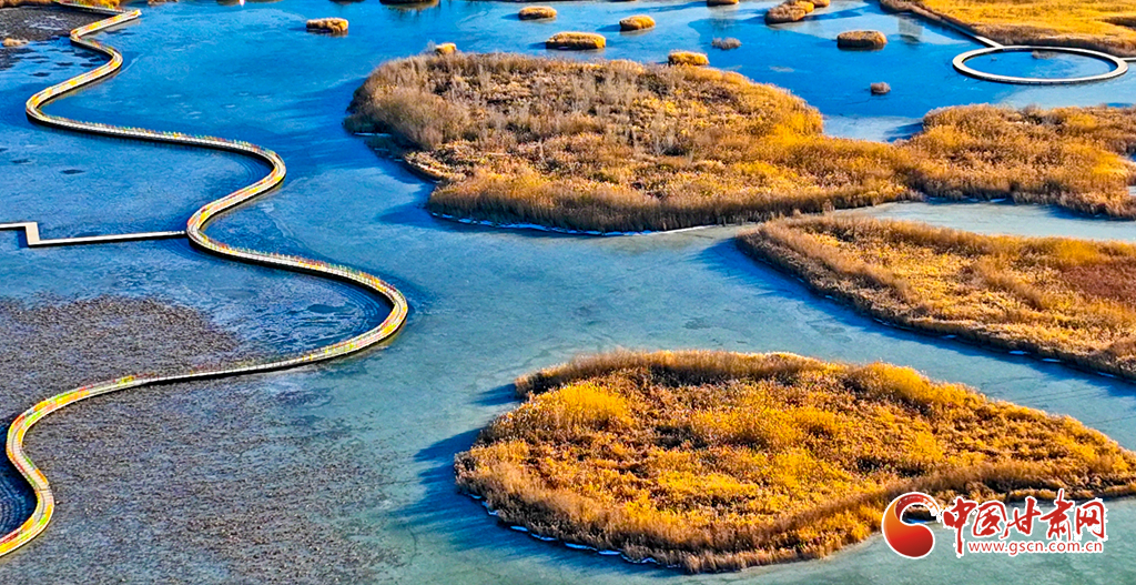 12月4日,張掖市黑河濕地國家級自然保護(hù)區(qū)內(nèi),經(jīng)風(fēng)霜浸染的蘆葦與蒲草披上金裝。從高空俯瞰,夕陽下的蘆葦蕩如金色海洋,蘆花隨風(fēng)輕舞,碧水凝冰環(huán)繞其間,宛如一幅鋪展的濕地金畫卷,吸引眾多游客與攝影愛好者前來觀賞拍攝。