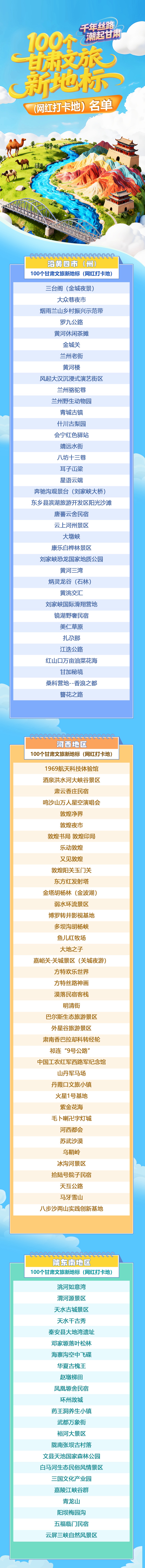 12月5日,由甘肅省文化和旅游廳主辦的“千年絲路·潮起甘肅—100個甘肅文旅新地標(網(wǎng)紅打卡地)”發(fā)布活動揭曉了最能代表甘肅文旅新風貌的100個文旅新地標,涵蓋全省自然景觀、歷史古跡、民俗體驗、鄉(xiāng)村旅游、紅色旅游等多個領域,形成一份甘肅文旅“打卡全景地圖”,將為省內(nèi)外游客游甘肅提供新的旅游指南。