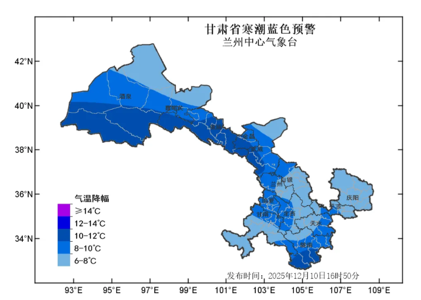 蘭州中心氣象臺2025年12月10日16時50分發(fā)布寒潮藍色預警:預計11日至13日清晨,全省大部自西向東最低氣溫下降6-8℃,其中河西五市、隴南等部分地方及隴中局部地方下降8~10℃,局地可達10℃以上,上述部分地方將出現(xiàn)寒潮。河西五市降溫時段為11日白天至12日白天,省內其余地方降溫時段為11日夜間至13日清晨。請注意防范!