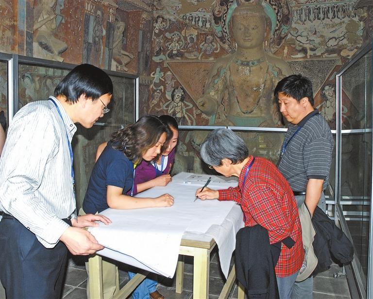 樊錦詩帶領(lǐng)項(xiàng)目團(tuán)隊(duì)在莫高窟第275窟核對(duì)石窟考古報(bào)告測(cè)繪圖。