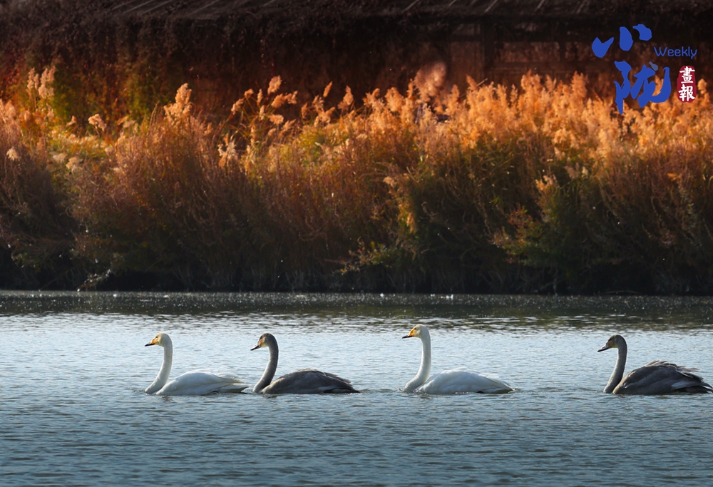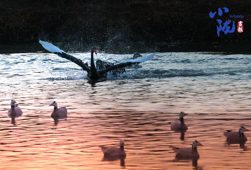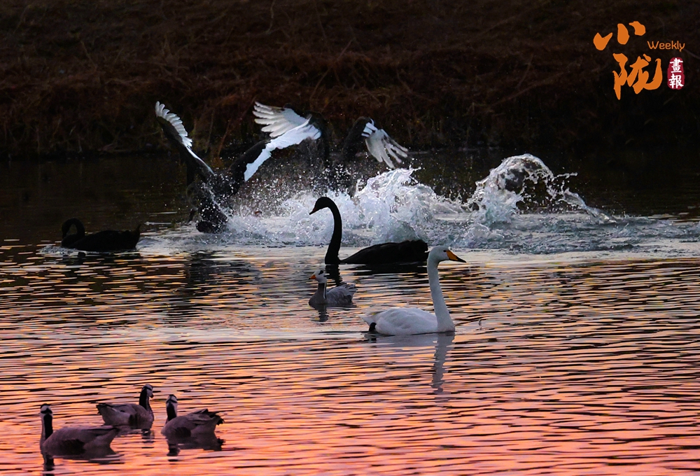 這里聚集了黑鸛、白鷺、鴛鴦、天鵝、赤麻鴨、灰雁等多種水鳥,它們?cè)邳S昏里愜意地游弋,或扎進(jìn)水里捕魚,或相互追逐戲水的畫面,既震撼又溫柔,成為攝影愛好者和游人爭相追逐的“冬日奇景”。