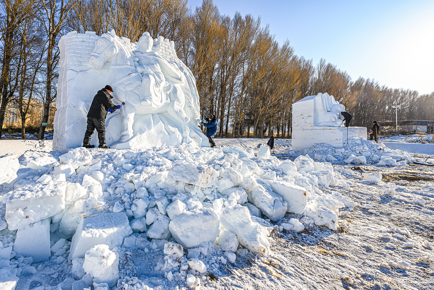中國甘肅網(wǎng)1月13日訊 據(jù)嘉峪關(guān)日報報道(融媒體中心記者 李巍 攝)揚(yáng)鏟塑造型,落刀雕精彩。1月10日,懸壁長城腳下,《昭君出塞》《九尾靈狐》《喜財神》等雪雕作品,在匠人們的精雕細(xì)琢中漸漸揭開“面紗”。