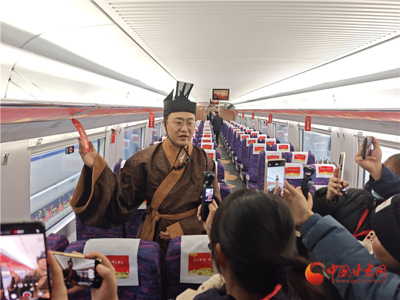為讓旅客沉浸式感受隴原文脈,22名身著特色服飾的專業(yè)講解員在車廂間流動(dòng)講解,將文物背后的故事娓娓道來(lái)。