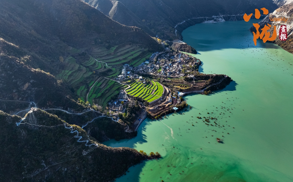 和煦的陽光傾灑而下,白龍江凝結(jié)的冰面宛如一塊巨大的天然翡翠,溫潤而晶瑩。它并非孤立存在,而是以一種寧靜而包容的姿態(tài),溫柔地環(huán)繞著、守護著岸上那些升起炊煙的村舍。