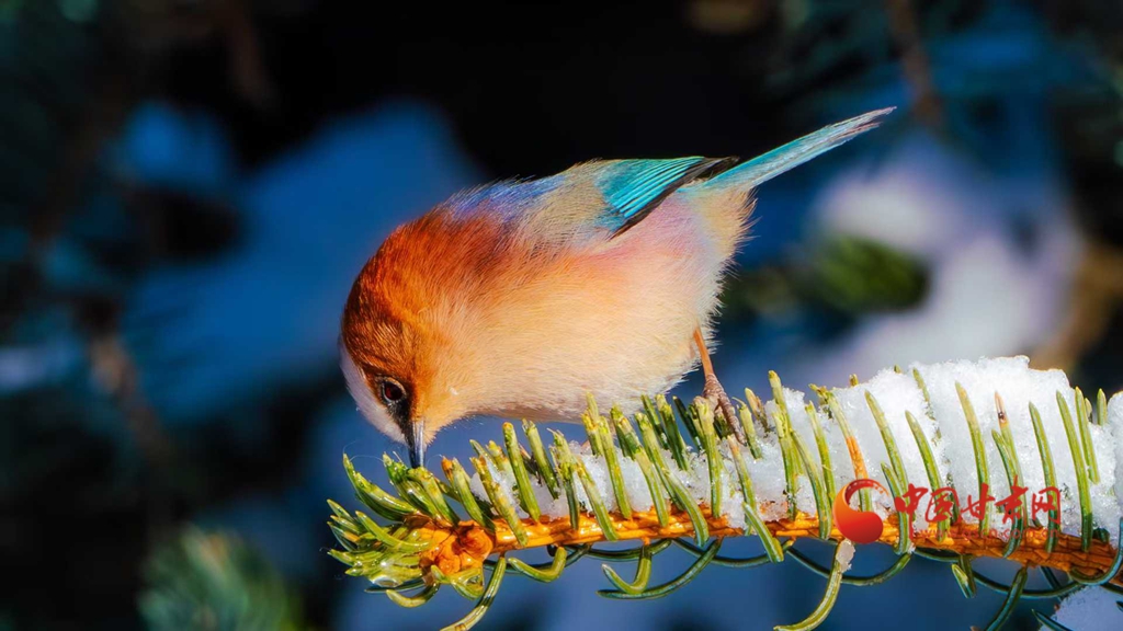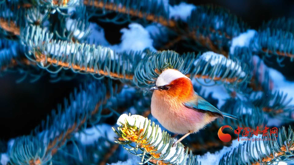 這群被譽為“祁連山精靈”的小鳥,頭頂雪白羽冠蓬松如絨,仿佛戴上了一頂天然的小絨帽,棕紅面頰溫潤似玉,在陽光下泛著柔和的光澤,藍綠背羽如同上好的寶石,在雪色映襯下泛著金屬般的質(zhì)感。淡粉與橙白相間的腹羽柔和雅致,層次分明,在純白背景的映襯下,形成強烈而和諧的視覺碰撞,它們或亭亭立于覆雪松枝,或靈巧穿梭于松針間隙,更有靈動的個體俯身探喙,啄取松針縫隙里的昆蟲,一聲輕脆的啄擊,劃破林間的清寂,卻更顯山野幽靜,羽翼輕振間,將“雪中覓食”的鮮活圖景永久定格。