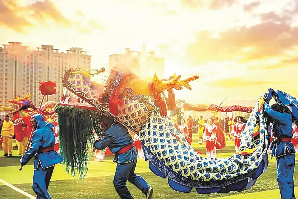 走在民樂縣勞動(dòng)文化主題廣場上,隱隱聽到遠(yuǎn)處傳來鑼鼓聲,起初若有若無,片刻間一陣緊似一陣。循聲望去,彩扇翻飛、花燈搖曳,獅子金紅的鬃毛在人縫里忽隱忽現(xiàn)——“哦,是一支社火隊(duì)!”人群中傳來這樣的歡呼。