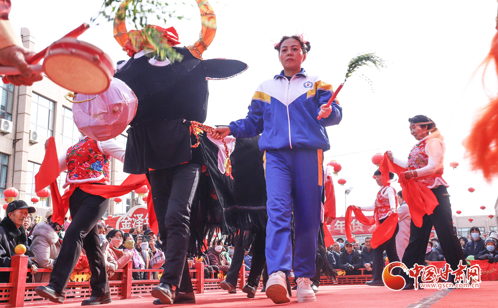 3月3日,張掖市臨澤縣金澤廣場(chǎng)上,群眾表演“驚牛”戲。