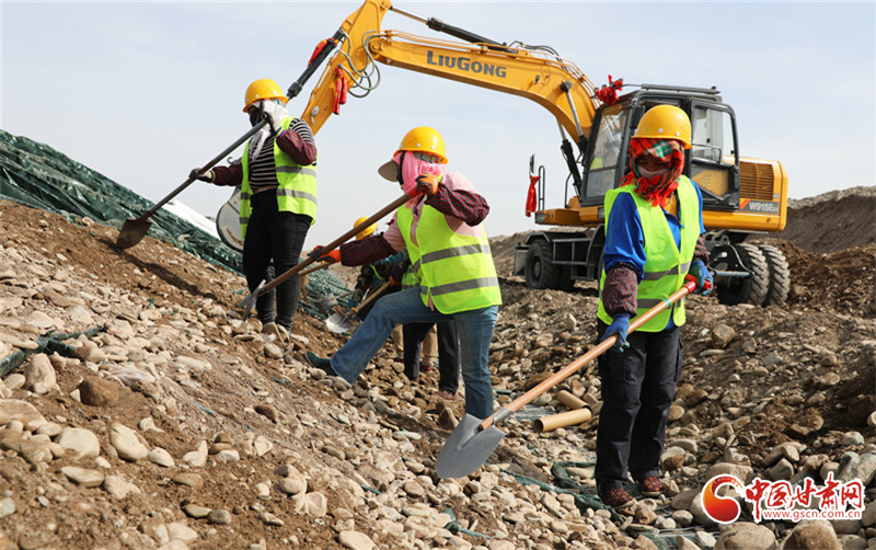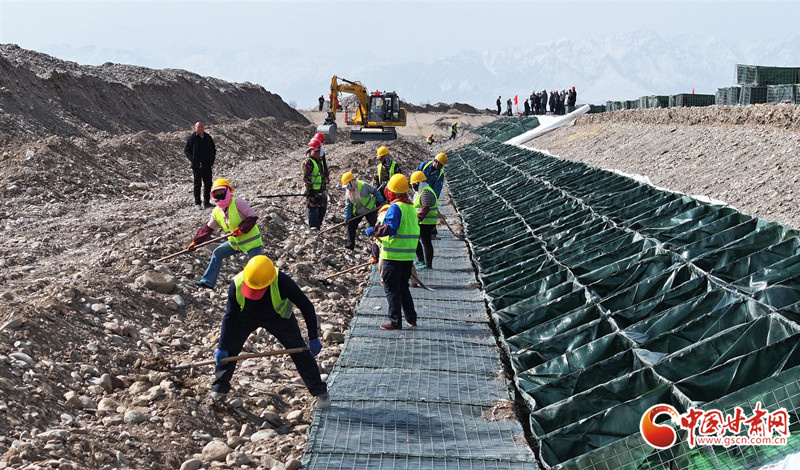 3月23日,在民樂縣大堵麻河防洪治理工程項(xiàng)目施工現(xiàn)場(chǎng),工人們正在緊張有序的修筑河堤。